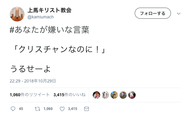 上の、上馬キリスト教会さんのTwitter上のハッシュタグ、#あなたが嫌いな言葉 に反応し、「クリスチャンなのに坊主バンドとライブ? 」 うるせーよ!と、思わずリツイしてしまいました。